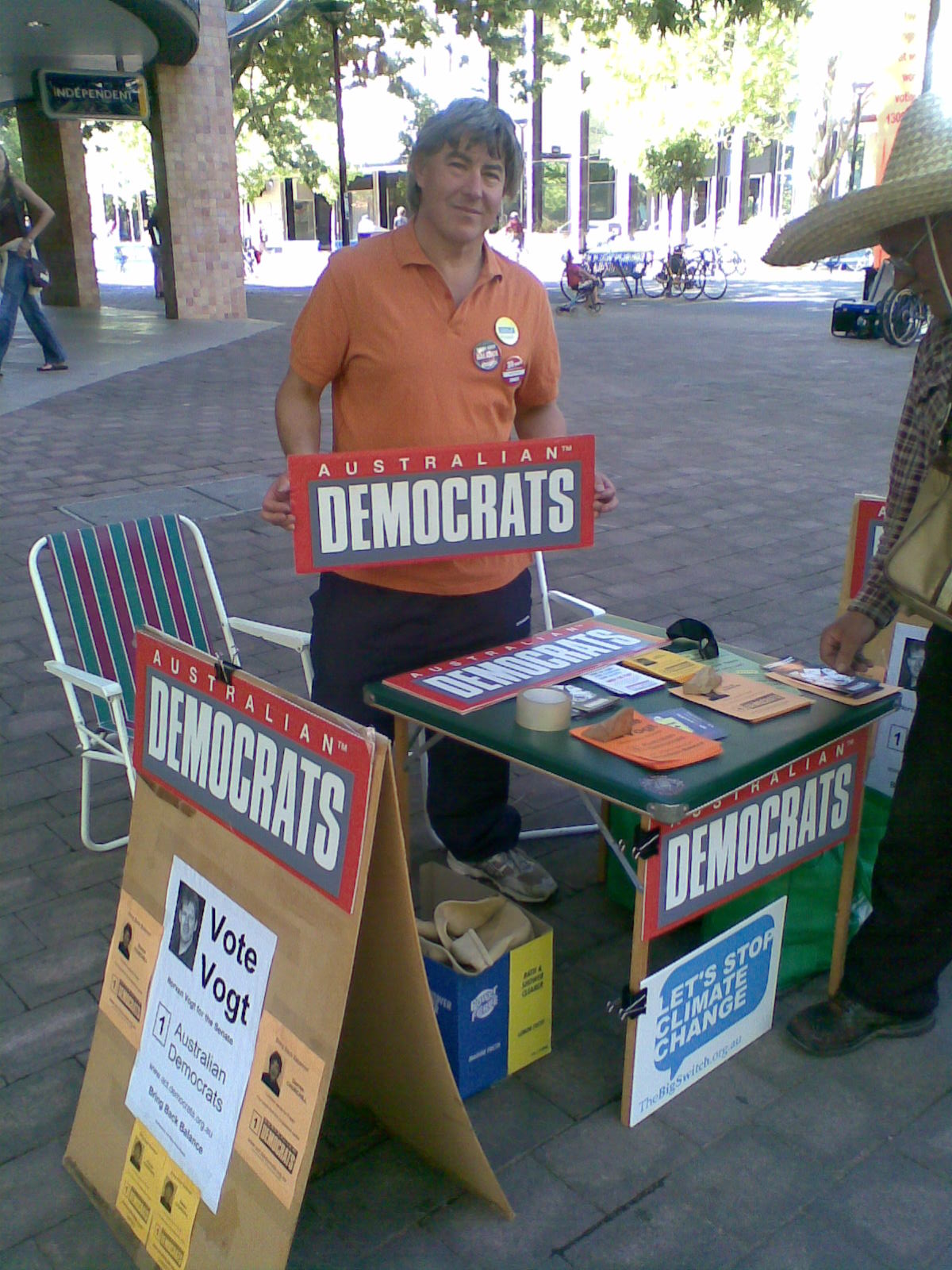 Australian Democrats candidate for Fraser, Darren Churchill, used today’s Walk Against Warming rally in Civic to remind voters of the Democrats role as Australia’s first environment party.
